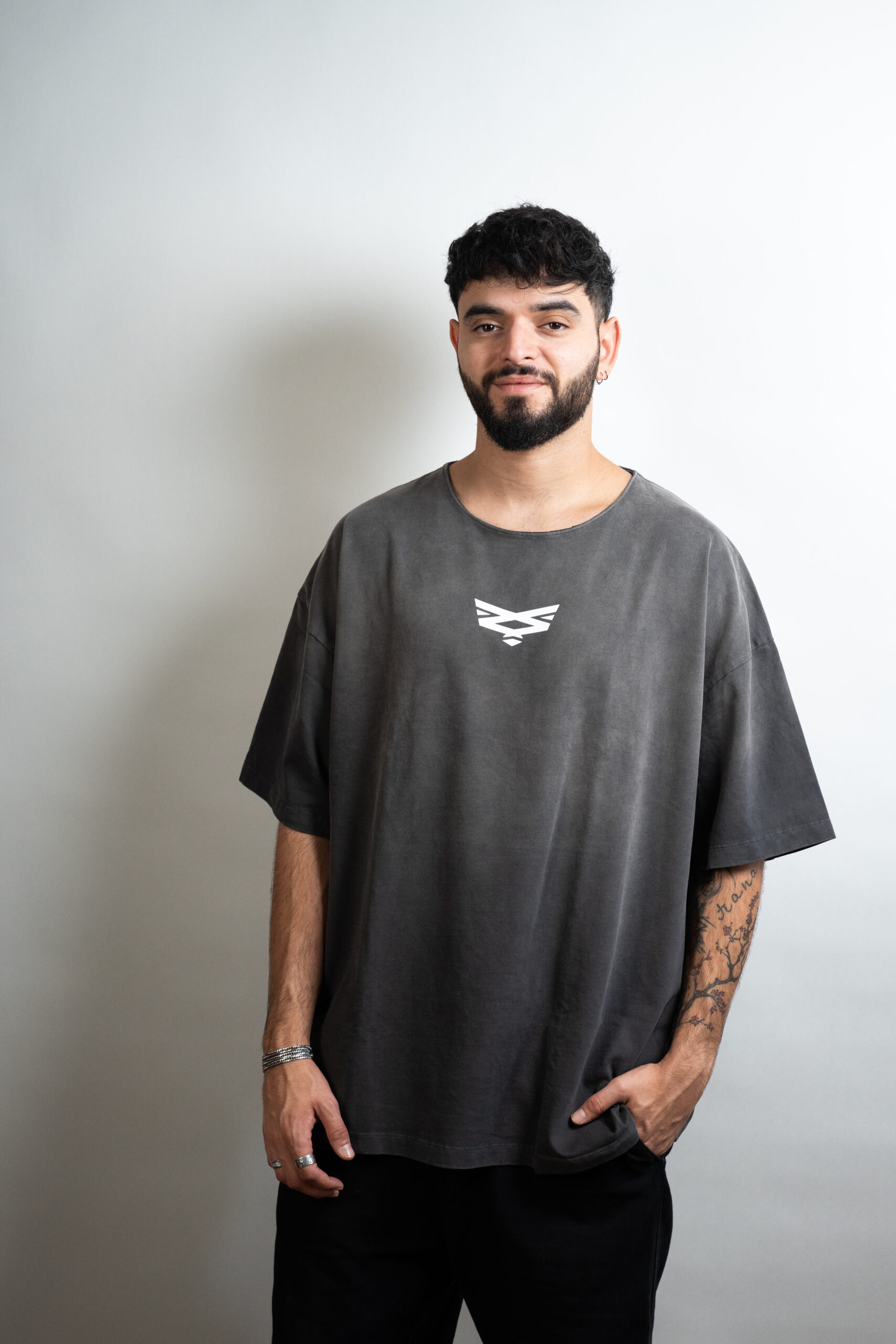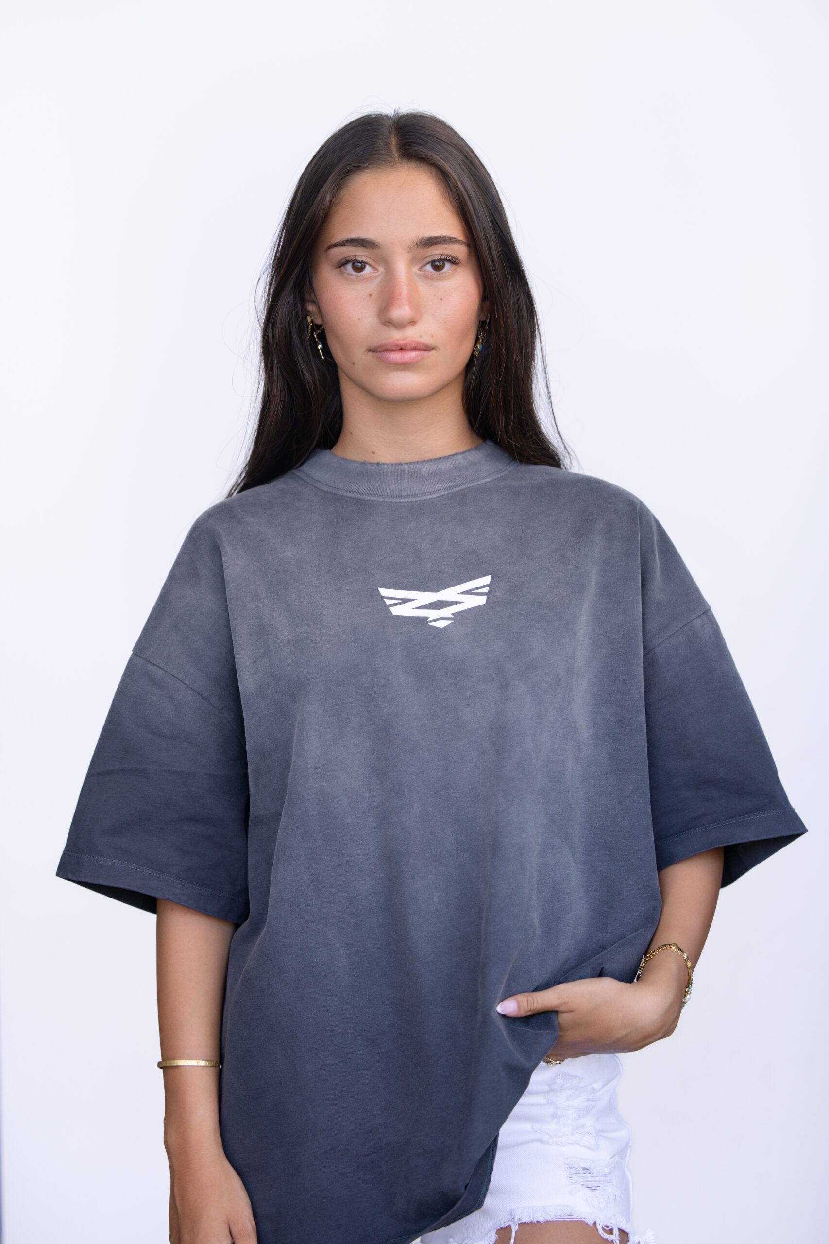 עם לוגו המותג בחזה והדפס שם המותג בחלק האחורי התחתון של החולצה.
