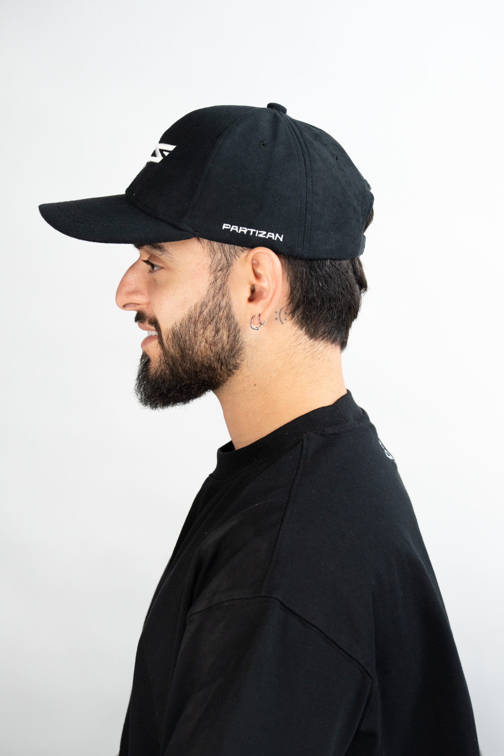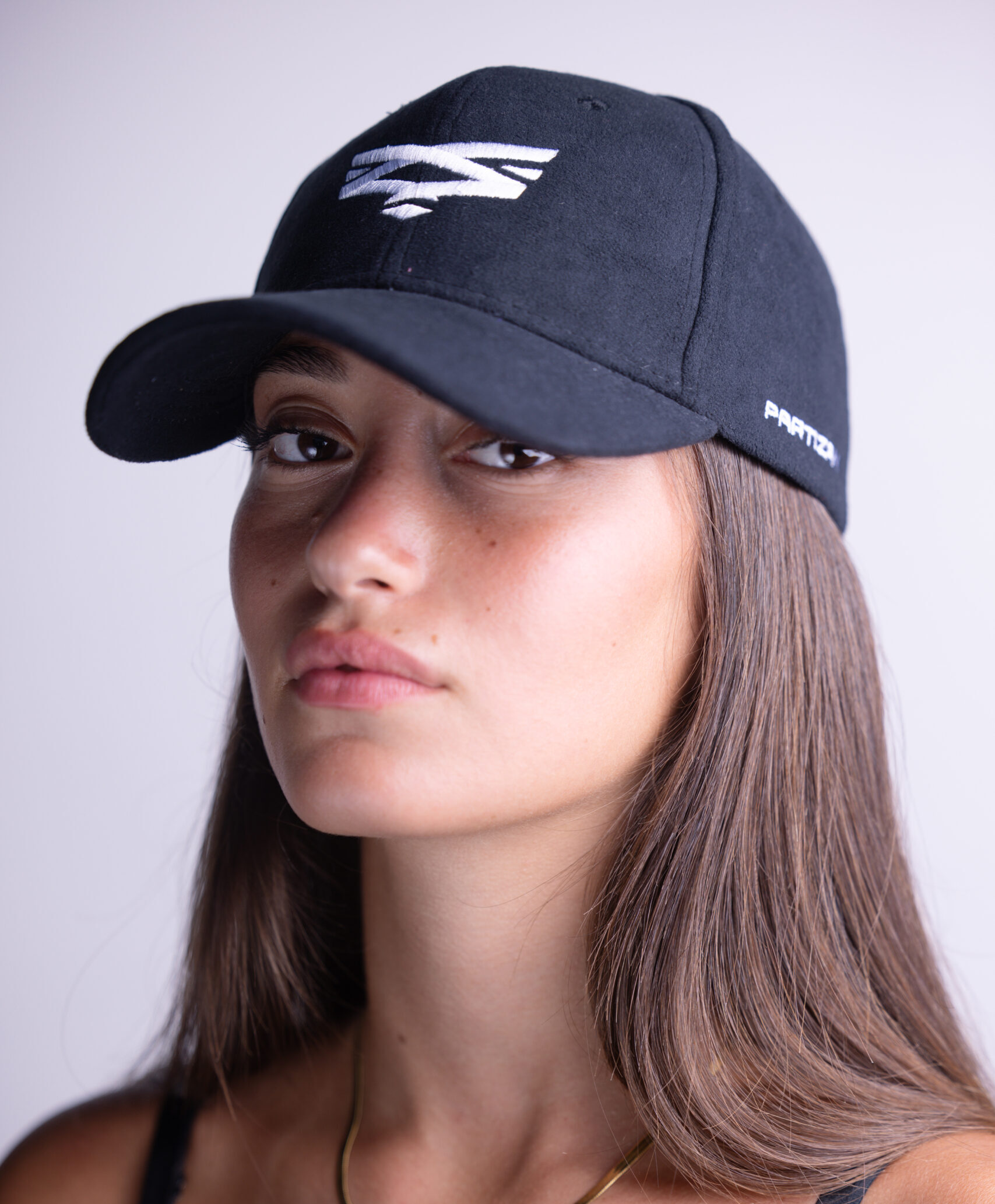 כובע מצחיה שחור עשוי 100% פוליאסטר דמוי זמש טהור. לוגו המותג רקום בחלק הקדמי של הכובע, ושם המותג רקום בקו תפר עדין בצד הכובע. כובע בעל מראה אלגנטי נקי. מעולה לחבישה יומיומית – מהפגישות ועד לשטח.