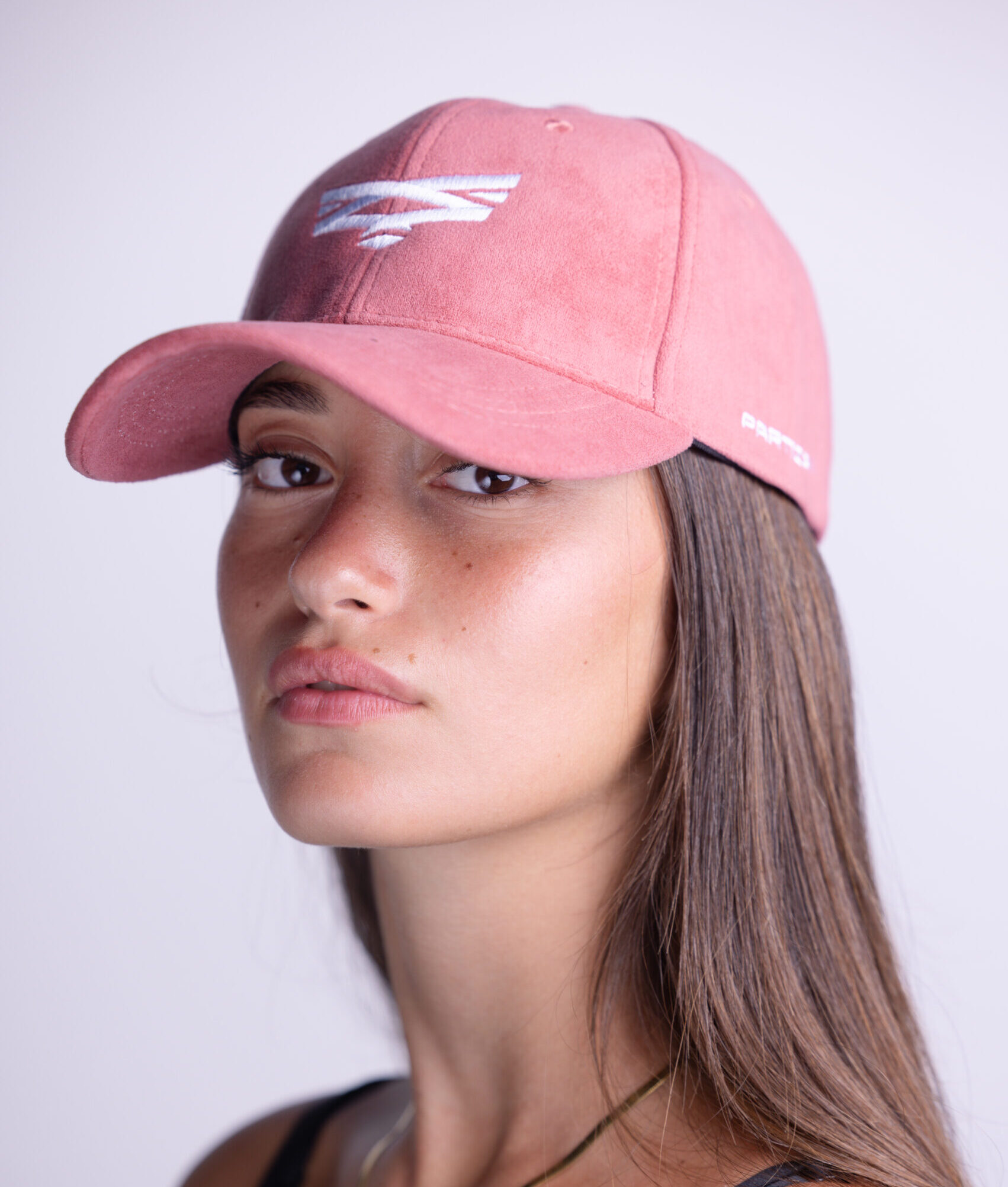 כובע מצחיה ורוד עשוי 100% פוליאסטר דמוי זמש טהור. לוגו המותג רקום בחלק הקדמי של הכובע, ושם המותג רקום בקו תפר עדין בצד הכובע. כובע בעל מראה אלגנטי נקי. מעולה לחבישה יומיומית – מהפגישות ועד לשטח.